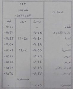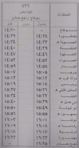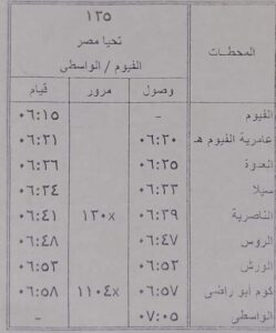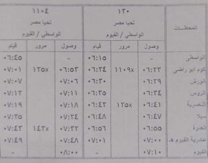 كذلك تعديل مواعيد قطار رقم 130 تحيا مصر الواسطي / الفيوم ليقوم الساعة 6.15 بدلا من الساعة 5.30 و قطار رقم 1104 تحيا مصر الواسطي / الفيوم ليقوم الساعة 6.45 بدلا من الساعة 7.05 و قطار رقم 125 تحيا مصر الفيوم / الواسطي ليقوم الساعة 6.15 بدلا من الساعة 6.35 و قطار رقم 143 تحيا مصر الفيوم / الجيزة ليقوم الساعة 7.30 بدلا من الساعة 7.15 كالجداول المرفقة .