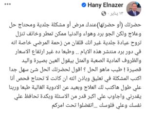 اشتهر الطبيب الراحل هاني الناظر، استشاري الأمراض الجلدية، بتقديم وصفات طبية طبيعية من المنزل، ووصف الدواء الصحيح لمتابعيه عبر صفحته الشخصية على «فيسبوك»، وهذه الوصفات لا تتخطي تكلفتها في العادة