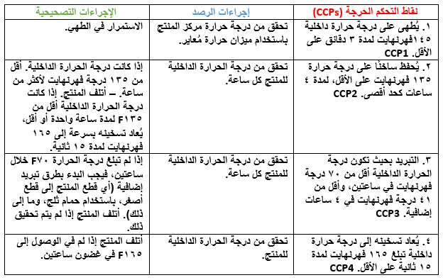 - تحديد النقاط الحرجة للمواد الغذائية المختلفة :تتضمن أمثلة نقاط التحكم الحرجة ما يلي (3)