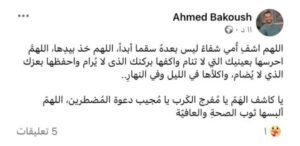 وكتب بقوش: “اللهم اشفِ أُمي شفاءً ليس بعده سقماً أبداً، اللهم خذ بيدِها، اللهم احرسها بعينيك التي لا تنام، واكفها بركنك الذي لا يُرام، واحفظها بعزك الذي لا يُضام، واكلأها في الليل وفي النهار”.