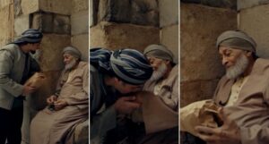 ظهر ياسر جلال في المشهد وهو يوزع العطايا على الفقراء، قبل أن يتوجه إلى صالح العويل، الذي جسّد شخصية رجل مُسن يُدعى “عم صالح”، ويدور بينهما الحوار التالي: